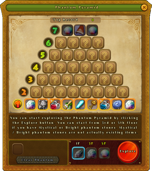 Note: Player will not be able to see the Mystical Phantom Stones and Bright Phantom Stones in their inventory. However, they will be able to see the current number of Mystical or Bright Phantom Stones in the Phantom Pyramid UI as shown below.